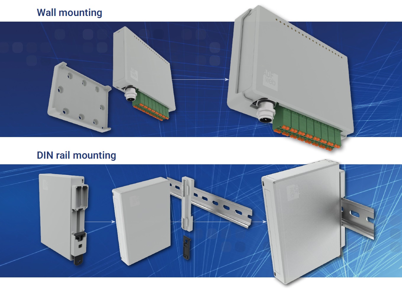 Installation flexibility: DIN rail mounting (horizontal or vertical) or wall/profile mounting with dedicated accessories.